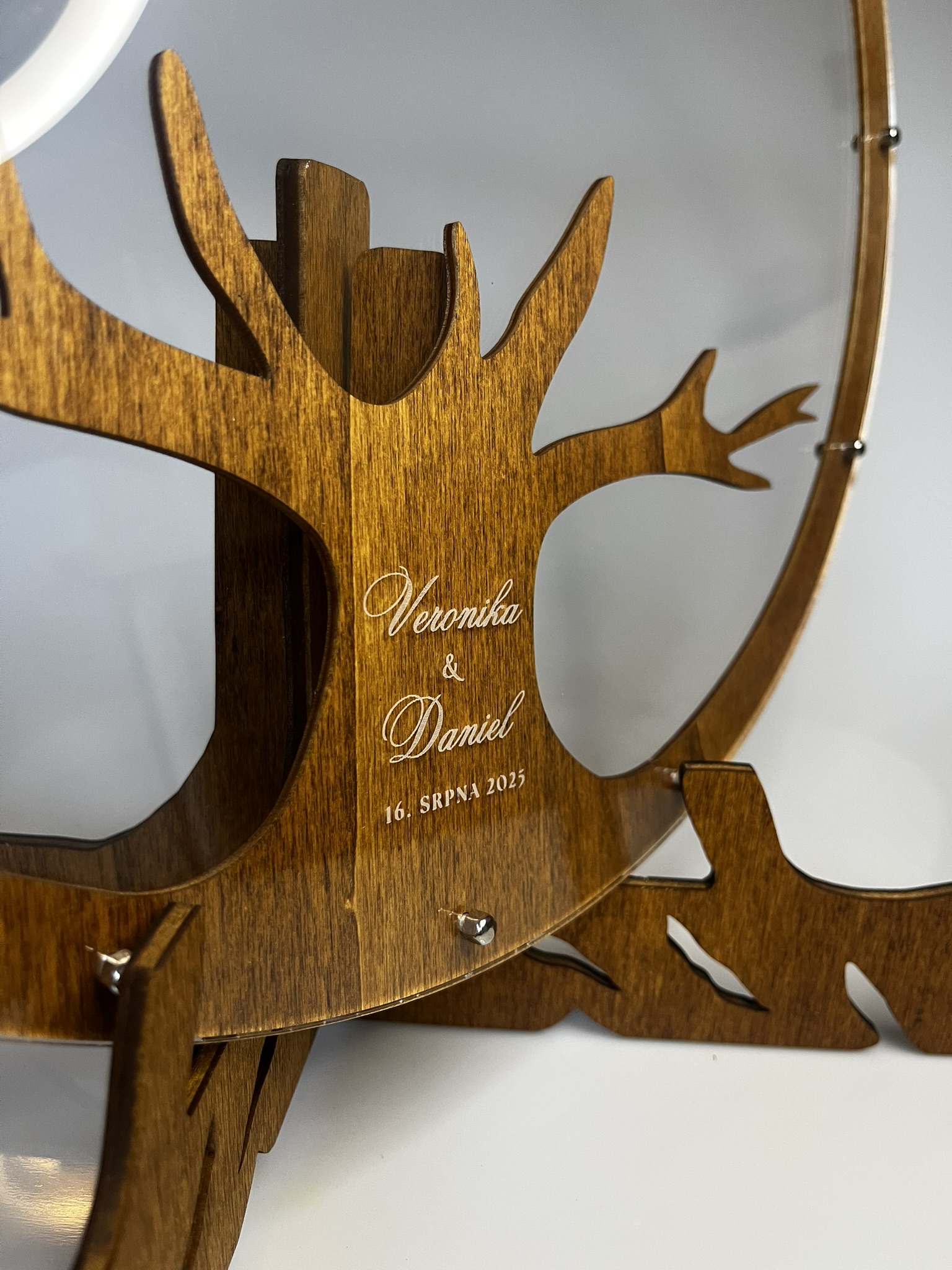 Strom pro vás vyrábíme ručně z kombinace křišťálového plexiskla a dřeva. Na čelní stranu vygravírujeme jména a datum, na zadní můžete mít osobní text nebo one-line art portrét podle fotografie. Vše v ceně. Přibalíme i elegantní stojánek a dárkovou krabičku — připraveno rovnou darovat.