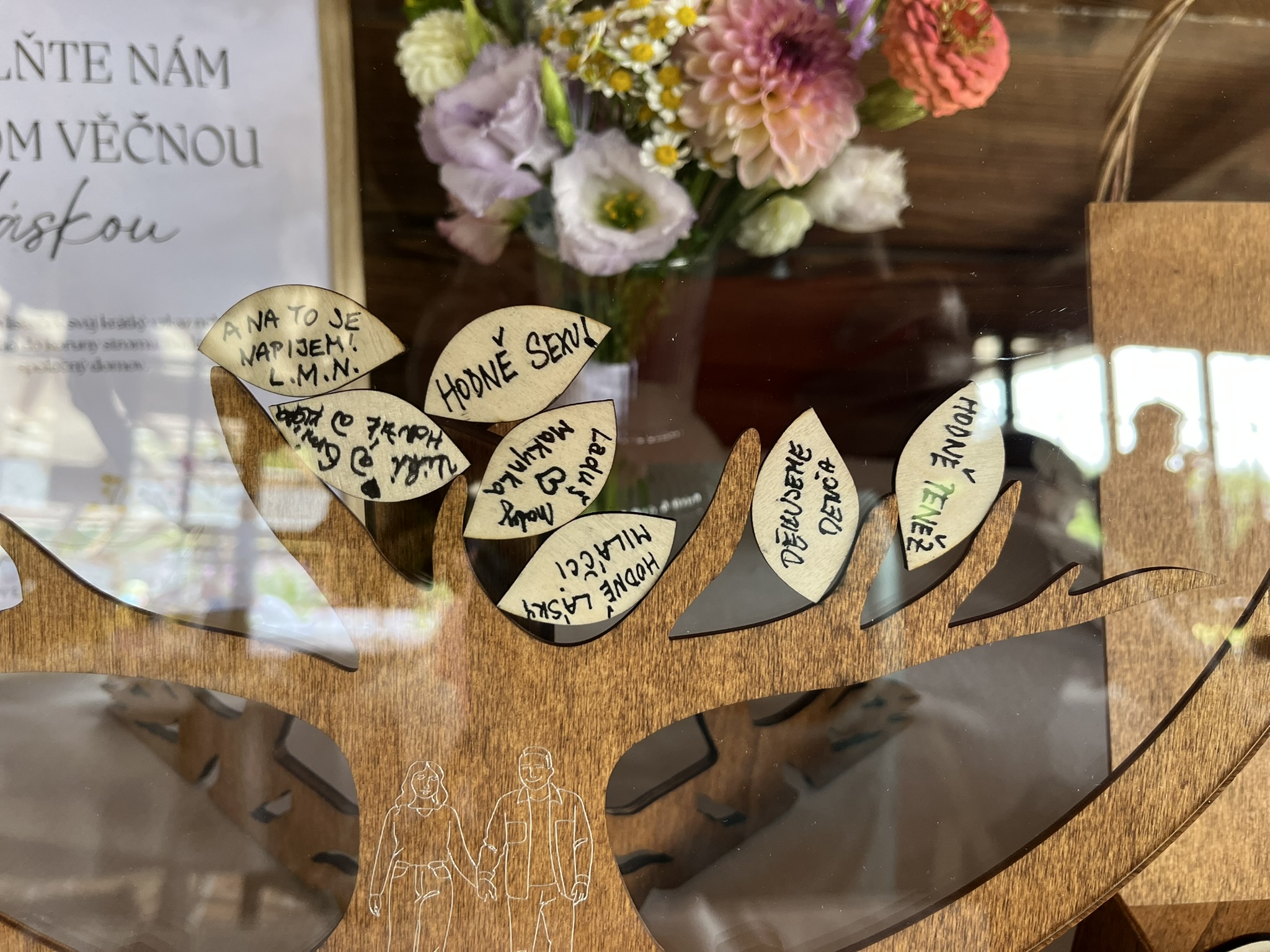 Každá svatba je jiná — ale okamžik, kdy se vám setkají pohledy a srdce, je společný všem. Svatební strom zachytí právě tuto chvíli. Hosté na lístky či srdce napíší vzkazy, přání i drobné postřehy, které by jinak časem vybledly. Vy si je uchováte na jediném místě — jako příběh vaší lásky, ke kterému se budete vracet.
